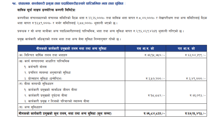 साविक सूर्या लाइफका सञ्चालकहरुले बैठक भत्ता बापत गत आर्थिक वर्षमा २२ लाख २६ हजार रुपैयाँ बुझेका छन् । त्यस्तै मासिक भत्ता बापत ८ लाख ४० हजार रुपैयाँ लिएका छन् । लेखापरीक्षक तथा अन्य समितिलाई बैठक भत्ता बापत १३ लाख ५९ हजार रुपैयाँ र मर्जर समितिलाई २ लाख ८८ हजार रुपैयाँ भुक्तानी गरिएको छ । प्रवन्धक तथा सो भन्दा माथिका अन्य पदाधिकारीहरुलाई पारिश्रमिक, भत्ता तथा अन्य सुविधा बापत २ करोड ९६ लाख ४३ हजार ९४२ रुपैयाँ भुक्तानी गरिएको छ ।