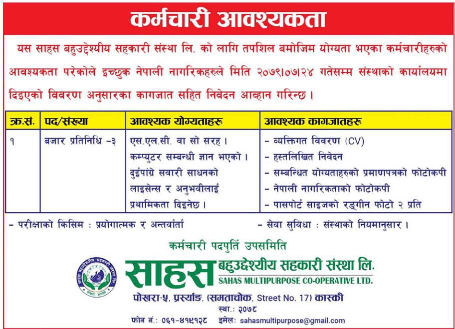 काठमाडौं । साहस बहुउद्देश्यीय सहकारी संस्थाले कर्मचारीकोे माग गरेको छ । संस्थाले बजार प्रतिनिधीका लागि ३ जना कर्मचारकिो माग गरेको जनाएको छ । उक्त पदका लागि एसएलसी वा सो सरह गरेको हुनुपर्नेछ । कम्प्युटर सम्बन्धी ज्ञान भएको हुनुपर्नेछ । ईच्छुक तथा योग्यता पुगेकाले कार्तिक २४ गतेभित्र आवेदन दिनुपर्नेछ ।