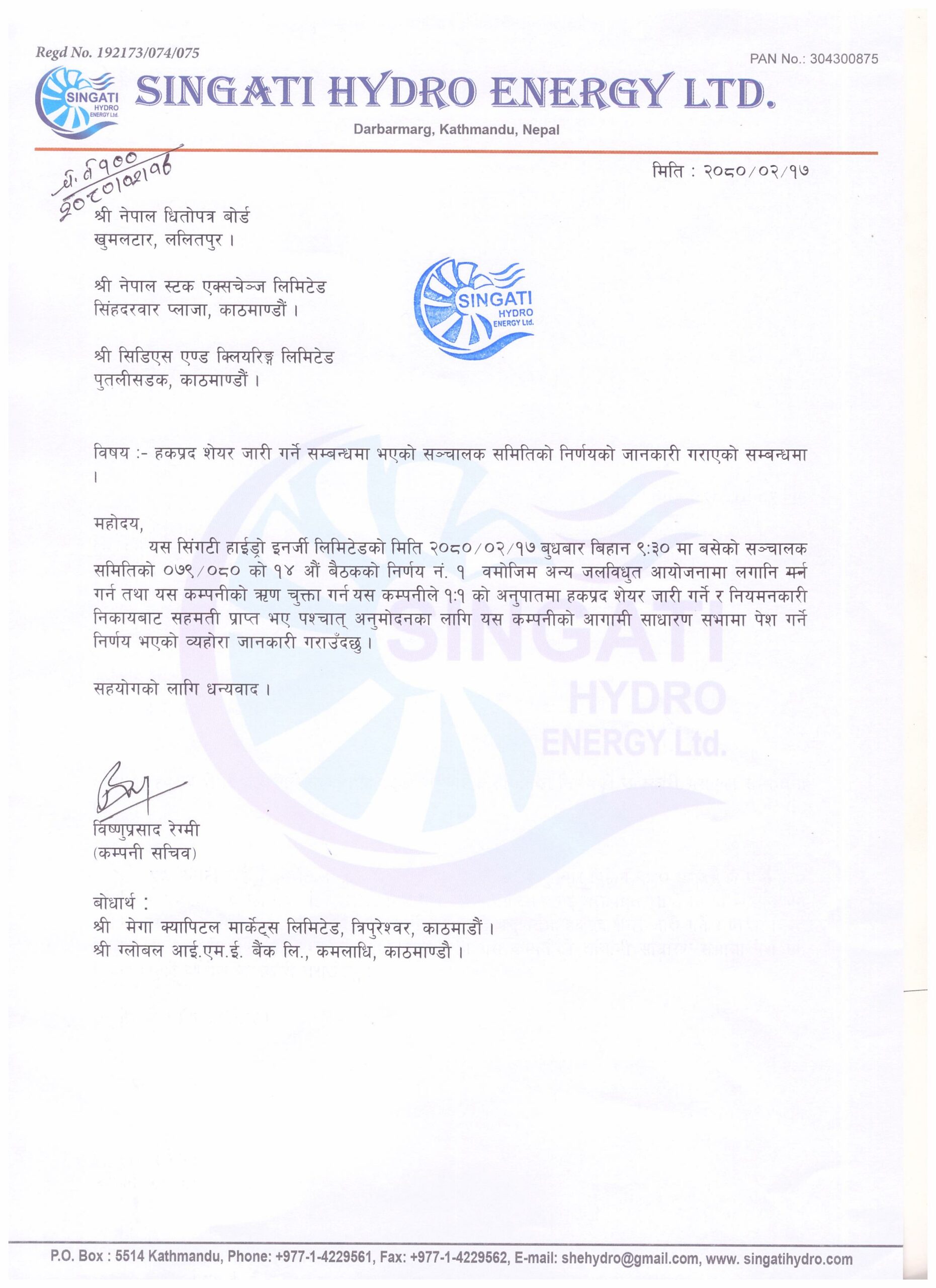 सिंगटी हाईड्रो इनर्जीले शतप्रतिशत हकप्रद शेयर जारी गर्ने
