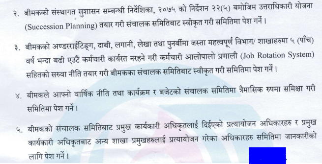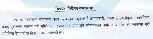 कम्पनीहरुमा यस्तो अवस्था देखिने वित्तीकै समितिले साउन १३ गते सम्पुर्ण जीवन तथा निर्जीवन बीमा कम्पनीहरुलाई परिपत्र जारी गर्दै संस्थागत सुशासन निर्देशिकामा भएका व्यवस्थालाई टेकेर सोहि अनुसार कार्यान्वयनमा ल्याउन निर्देशन दिएको छ ।