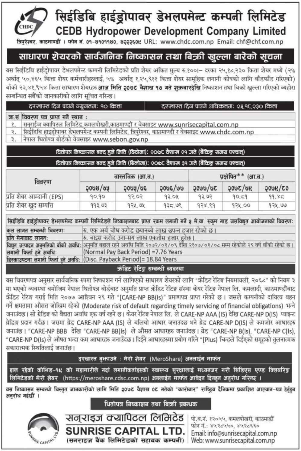 कम्पनीको उक्त शेयरमा सम्पूर्ण सि—आश्वा सदस्य बैंक तथा वित्तीय संस्था र मेरो सेयरमार्फत अनलाइनमार्फत आवेदन दिन सक्नेछन् ।आईपीओ निष्काशनका लागि गराएको रेटिङ्गमा केयर रेटिङ्ग नेपालले कम्पनीलाई केयर एनपी डबल बि आइएस रेटिङ्ग प्रदान गरेको छ।