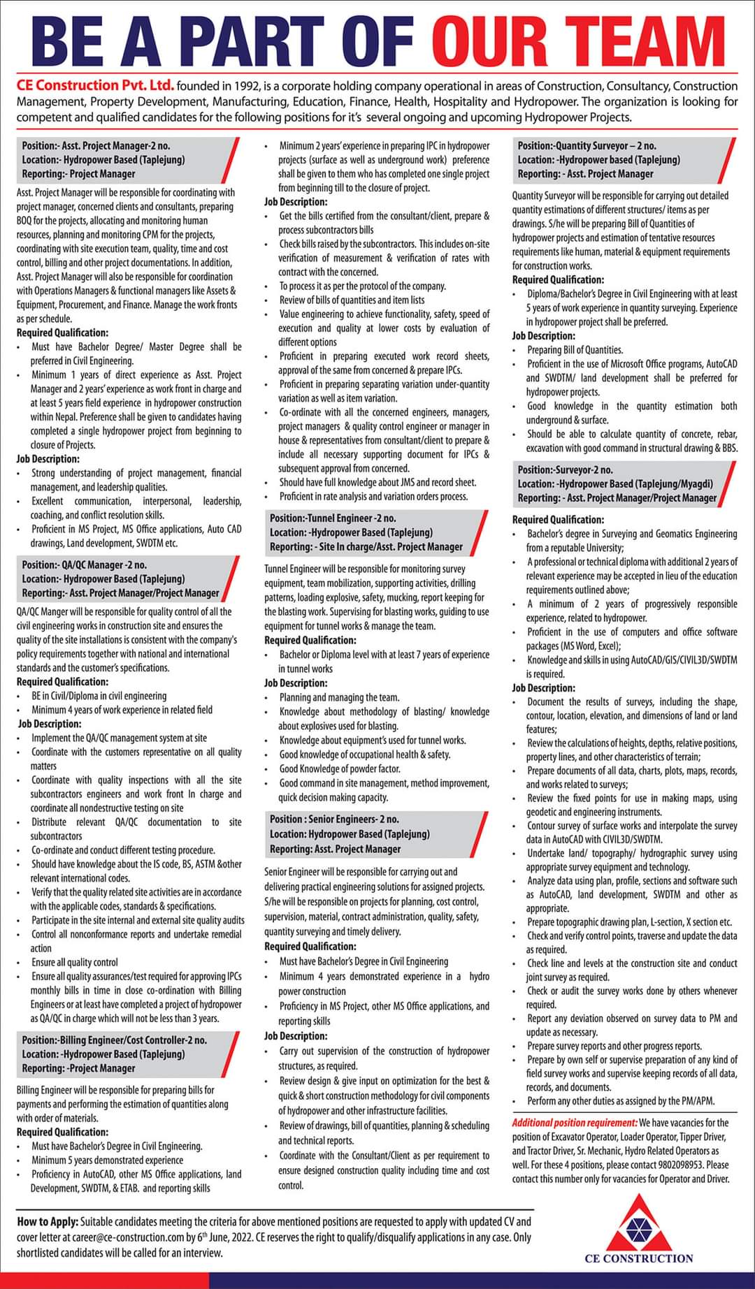 सिई कन्सट्रक्सनले माग्यो धेरै पदका लागि कर्मचारी