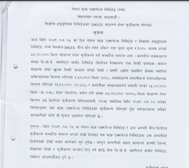 काठमाडौं । आज सिक्लेस हाइड्रोपावर लिमिटेडको साधारण शेयर (आइपीओ) सोमवार नेपाल स्टक एक्सचेञ्जमा सूचिकृत भएको छ । कम्पनीले ८५ लाख कित्ता साधारण शेयर सूचिकृत गराएको हो । कम्पनीको स्टक सिम्बोल एसआईकेएलईएस रहेको छ ।