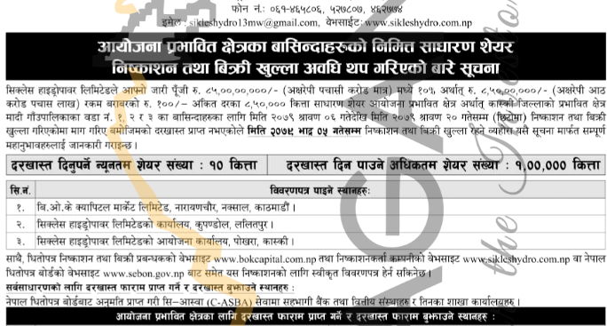 काठमाडौं । सिक्लेस हाइड्रोपावर लिमिटेडले साउन ६ गते देखि निष्काशन गरेको आइपीओमा आवेदन दिने आज अन्तिम दिन रहेको छ । कम्पनीले आयोजना प्रभावित क्षेत्रका बासिन्दाहरूका लागि आफ्नो जारीपूँजी ८५ करोडको १० प्रतिशत अर्थात ८ करोड ५० लाख बराबरको प्रतिशेयर १०० अंकित मूल्यका ८ लाख ५० हजार कित्ता आइपीओ निष्काशन गरेको हो ।