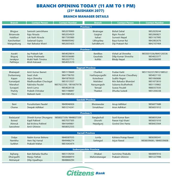 काठमाडौं । आज सिटिजन्स बैंकले उपत्यकाभित्र तथा उपत्यका बाहिरका विभिन्न शाखा कार्यालयबाट सेवा दिने भएको छ । उक्त शाखाहरु विहान ११ बजेदेखि १ बजेसम्म खुला हुने छन् ।