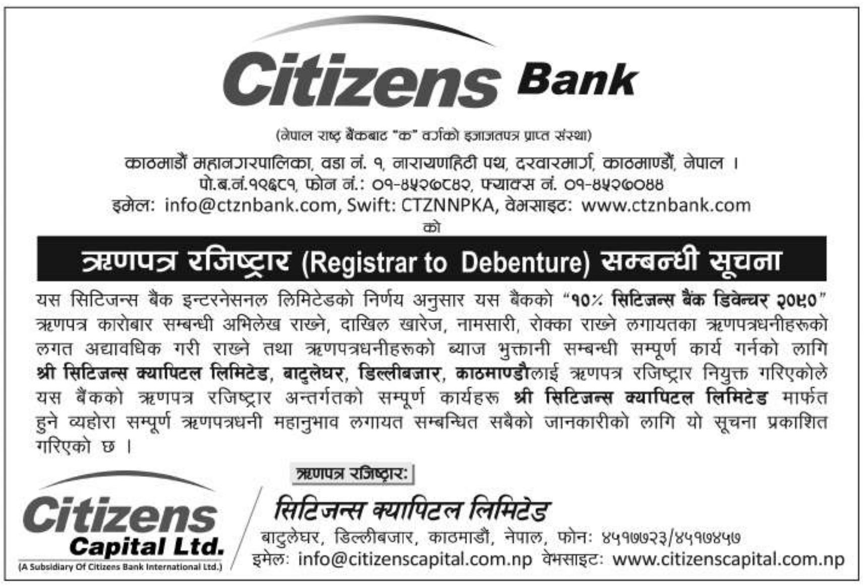 काठमाडौं । सिटिजन्स बैंक इन्टरनेसनल लिमिटेडको ऋणपत्र रजिष्ट्रारमा सिटिजन्स क्यापिटल लिमिटेड नियुक्त भएको छ । बैंकको ‘१० प्रतिशत सिटिजन्स बैंक डिवेन्चर २०९०’ ऋणपत्र कारोबारसम्बन्धी अभिलेख राख्ने, दाखिल खारेज, नामसारी, रोक्का राख्ने लगायतका सम्पूर्ण काम गर्नका लागि रजिष्ट्रारमा सिटिजन्स क्यापिटल लिमिटेड, बाटुलेघर, डिल्लीबजार, काठमाडौंलाई नियुक्त गरिएको बैंकले जनाएको छ ।