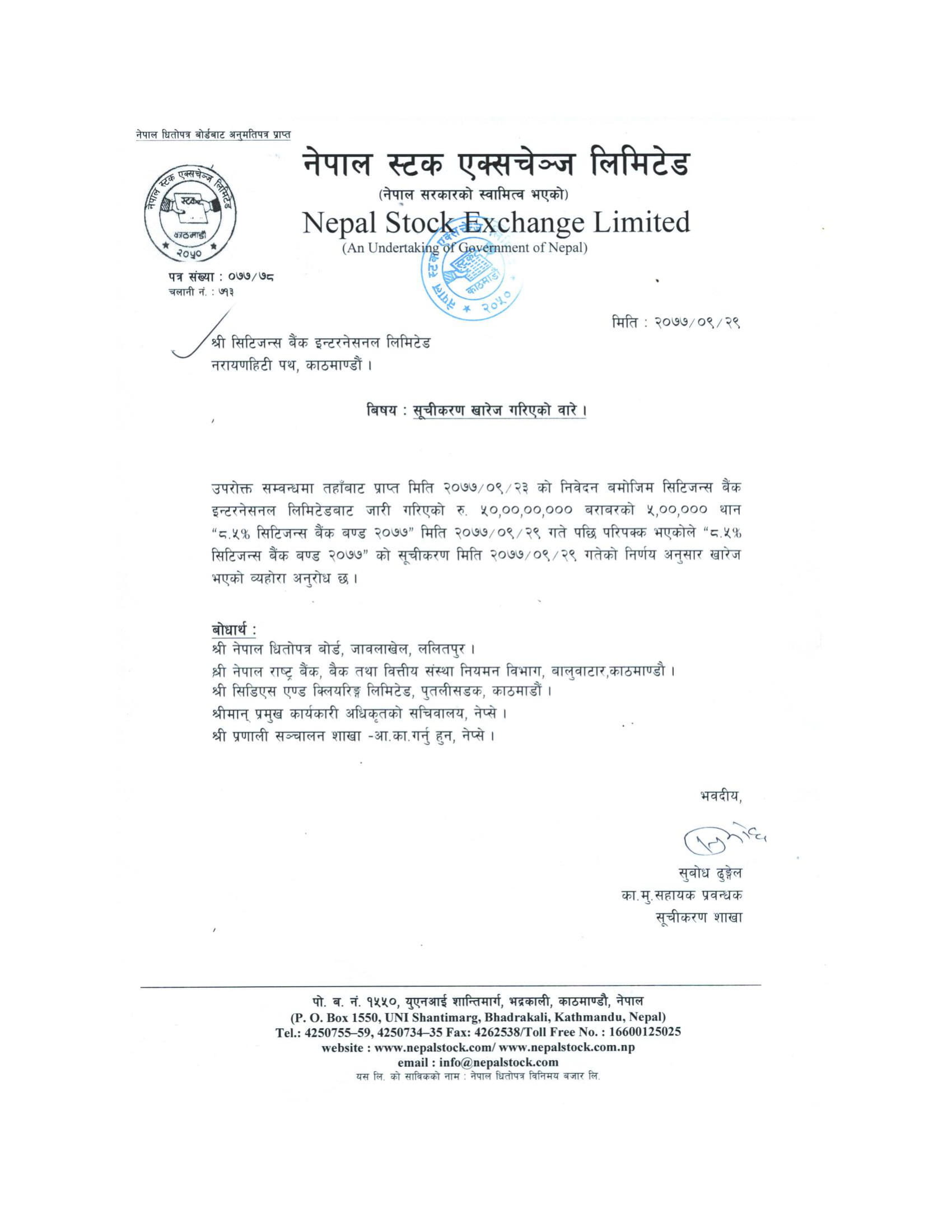 काठमाडौं । सिटिजन्स बैंक लिमिटेडको ५ लाख कित्ता ऋणपत्र सूचीकरण खारेज भएको छ । नेप्सेका अनुसार बैंकले जारी गरेको ८ दशमलव ५ प्रतिशत सिटिजन्स बैंक बण्ड २०७७ को सूचीकरण पुस २९ गतेदेखि परिपक्व भएकाले सूचीकरण खारेज गरिएको हो ।