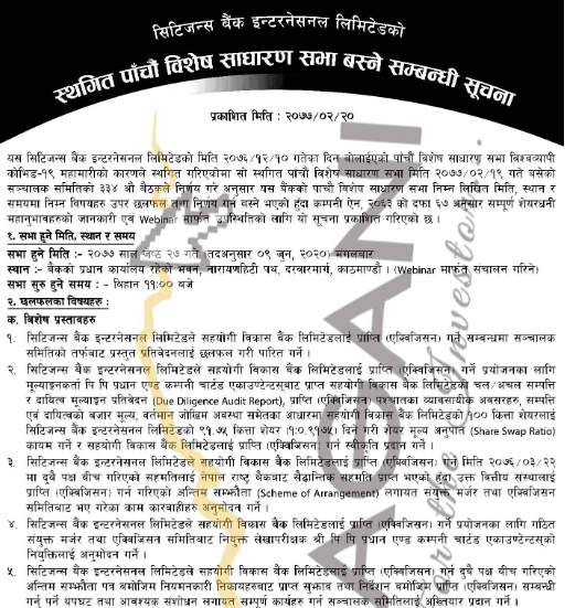 काठमाडौं । सिटिजन्स बैंक इन्टरनेसनल लिमिटेडको पाँचौ स्थगित विशेष साधारण सभा जेठ २७ गते मंगलबार पुनः हुने भएको छ ।उक्त सभा बैंकको प्रधान कार्यालय नाराणहिटी पथ दरबारमार्गमा बिहान ११ बजेदेखि वेविनार मार्फत सभा आयोजना गरिने बैंकले जनाएको छ।