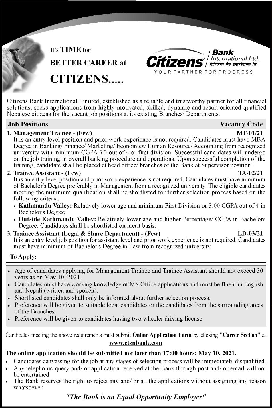 काठमाडौं । सिटिजन्स बैंकले विभिन्न पदका लागि कर्मचारकिो माग गरेको छ । बैंकले म्यानेजमेन्ट ट्रेनीका लागि केही, ट्रेनी असिस्टेन्टका लागि केही र ट्रेनी असिस्टेन्ट लेगल तथा शेयर डिपार्टका लागि केही संख्यामा कर्मचारीको माग गरेको जनाएको छ ।