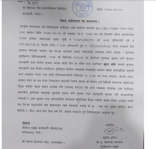 सिटिजन्स बैंकको सञ्चालक समितिमाथि धितोपत्र बजार मूल्यमा चलखेल गरेको वा मिलेमतो गरेको हुनसक्ने आंशकामा पत्र काटेको हो । नेप्सेले सोधेको स्पष्टिकरणमा बैंकले शेयर कारोबार समयमा बैंकले लाभांश घोषणा गरेको र उक्त लाभांश घोषणाबारे नेप्सेमा जानकारी गराइएको पत्रमा सञ्चालक समितिको बैठक बसेको समय समेत उल्लेख नगरेको भन्दै स्पष्टिकरण सोधेको हो । सिटिजन्स बैंकले नेप्सेमा बुझाएको लाभांश वितरण सम्बन्धी जानकारी दिने पत्रमा सञ्चालक समितिको बैठक कुन दिन बसेको हो, सो को जानकारी समेत नदिएकोले स्पष्ट पार्न भनिएको हो ।