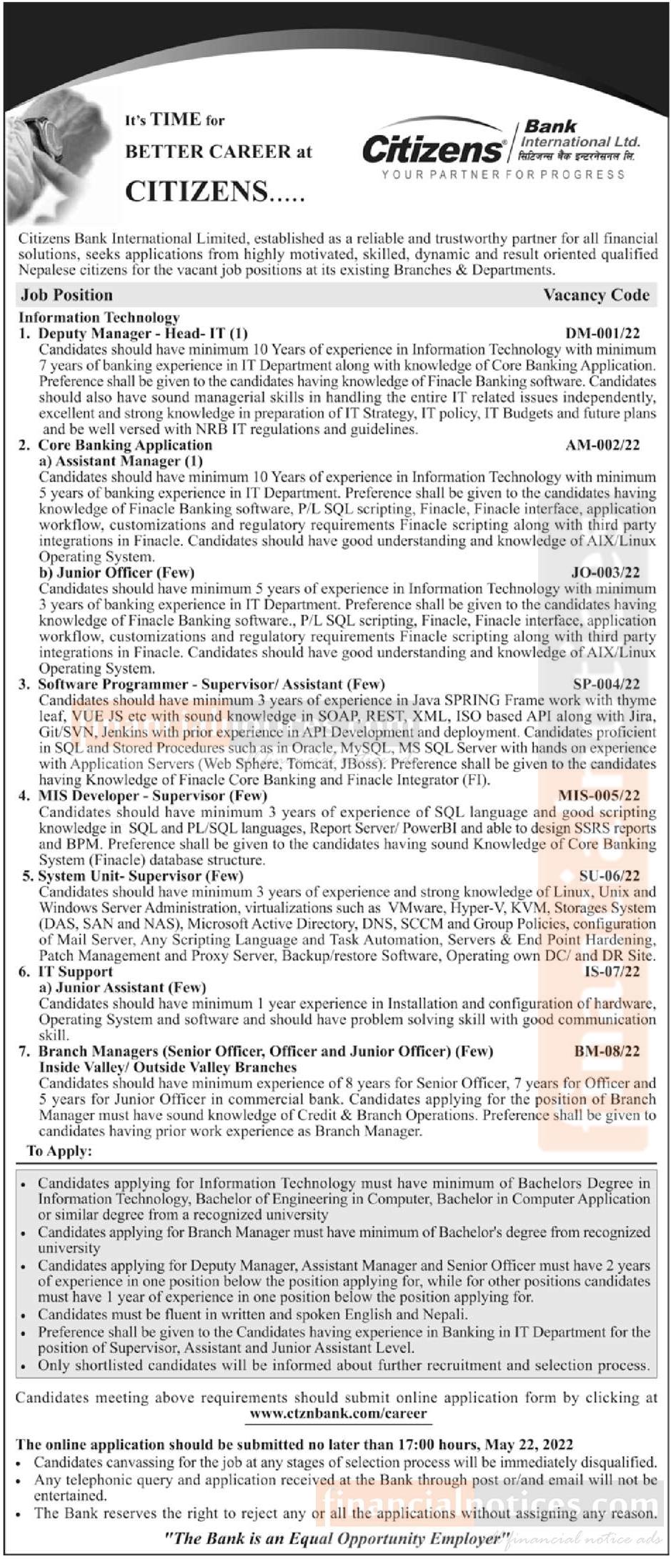 काठमाडौं । सिटिजन्स बैंकले विभिन्न पदका लागि कर्मचारीको माग गरेको छ । बैंकले इन्फरमेसन टेक्नोलोजीमा डेपुटि म्यानेजर हेड आइटीका लागि १ जना, कोर बैंकिङ एप्लीकेशनमा असिस्टेन्ट म्यानेजरका लागि १ जना र जुनियर अफिसरका लागि केही, सफ्टवेर प्रोगामरमा सुपरभाइजर र असिस्टेन्टका लागि केही संख्यामा, एमआइएस डेपलपरमा सुपरभाइजरका लागि केही, स्टिम यूनिटमा सुपरभाइजरका लागि केही, आइटी सपोर्टका लागि केही र ब्रान्च म्यानेजरमा सिनियर अफिसर, अफिसर र जुनियर अफिसरका लागि कर्मचारीको माग गरेको हो ।