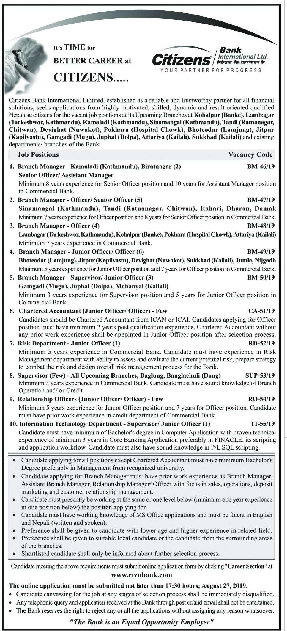 सिटिजन्स बैंकले विभिन्न पदका लागि कर्मचारीको माग गरेको छ । बैंकले ब्रान्च म्यानेजरका लागि जना, ब्रान्च म्यानेजर, अफिसर र सिनियर अफिसरका लागि ५ जना, अफिसर लेभलका लागि ब्रान्च म्यानेजर ४ जना, जूनियर अफिसर र अफिसर लेभलका लागि ब्रान्च म्यानेजर ६ जना, चार्टर्ड अकाउन्टेन्टका लागि केही र रिक्स डिपार्टका लागि केही कर्मचारीको माग गरेको हो ।