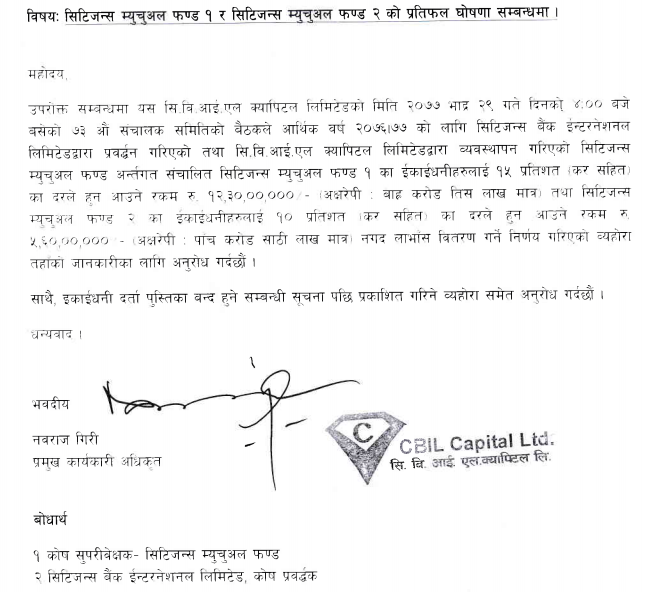 फण्डका हनुसार सिटिजन्स म्युचुअल फण्ड १ का इकाईधनीले कर सहित १५ प्रतिशतका दरले हुन आउने १२ करोड ३० लाख नगद र सिटिजन्स म्युचुअल फण्ड २ का इकाईधनीले कर सहित १० प्रतिशतका दरले हुन आउने ५ करोड ६० लाख नगद लाभांश घोषणा गरेको हो ।