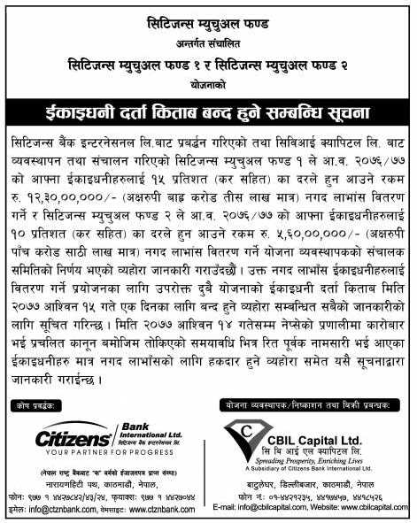 त्यस्तै, सिटिजन्स म्युचुअल फण्ड – २ का इकाईधनीहरूलाई कर सहित १० प्रतिशतका दरले हुन आउने ५ करोड ६० लाख रूपैयाँ बराबरको नगद लाभांश वितरण गर्ने घोषणा गरेको छ ।