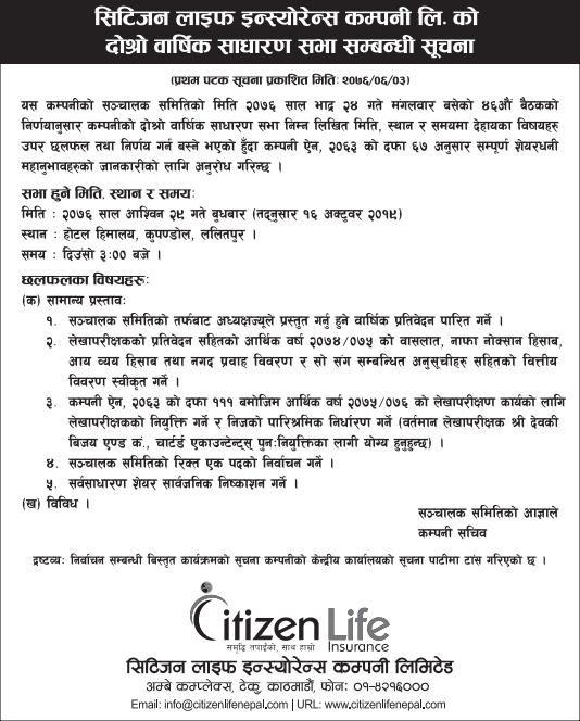 काठमाडौं । सिटिजन्स लाइफ इन्स्योरेन्सले असोज २९ गते दोस्रो वार्षिक साधारण सभा गर्ने भएको छ । भदौ २४ गते मङगलबार बसेको संचालक समितिको बैंठकको निर्णयले उक्त सभाको मिति तय गरेको हो ।