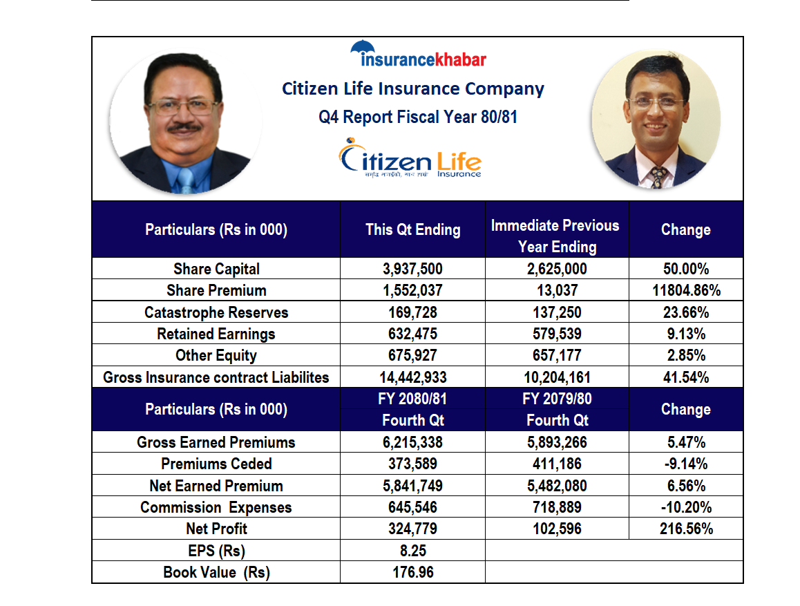 काठमाडौं । सिटिजन लाइफ इन्स्योरेन्स कम्पनी लिमिटेडले गत आर्थिक वर्ष २०८० /८१को चौथो त्रैमासको वित्तीय विवरण प्रकाशन गरेको छ । ३ अर्ब ९३ करोड शेयर पूँजी भएको कम्पनीले गत आर्थिक वर्षको चौथो त्रैमाससम्ममा ३२ करोड ४७ लाख रुपैयाँ नाफा आर्जन गरेको छ । अघिल्लो आर्थिक वर्षको सोही अवधिमा कम्पनीले १० करोड २५ लाख रुपैयाँ नाफा आर्जन गरेको थियो । अघिल्लो आर्थिक वर्षको सोही अवधिको तुलनामा कम्पनीको नाफा २१६.५६ प्रतिशतले वृद्धि भएको हो ।