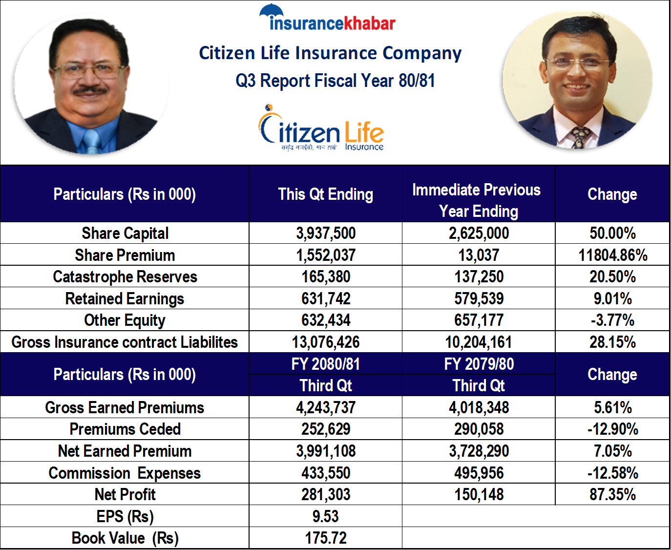 काठमाडौं । सिटिजन लाइफ इन्स्योरेन्स कम्पनी लिमिटेडले चालु आर्थिक वर्ष २०८० /८१को तेश्रो त्रैमासको वित्तीय विवरण प्रकाशन गरेको छ ।