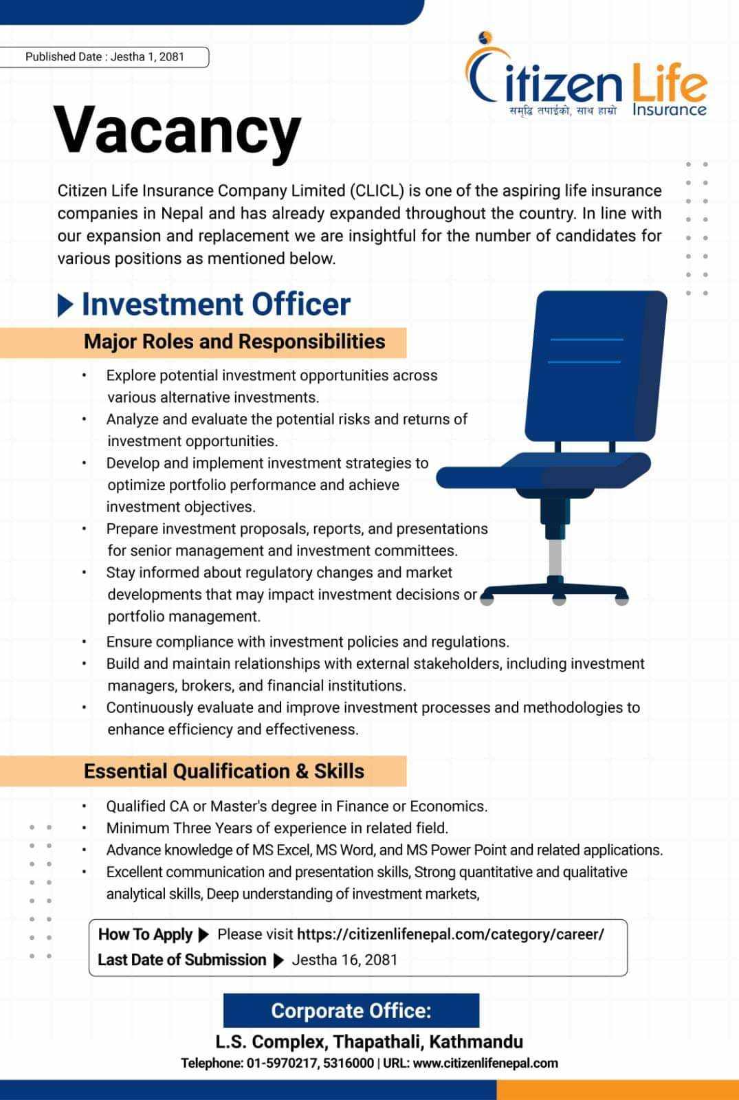 काठमाडौं । सिटिजन लाइफ इन्स्योरेन्स कम्पनीले कर्मचारी माग गरेको छ । कम्पनीले इन्भेष्टमेन्ट अफिसरका लागि कर्मचारी माग गरेको हो । उक्त पदका लागि सिए अथवा फाइनान्स, अर्थशास्त्रमा स्नाकोत्तर गरेको हुनुपर्नेछ । सम्बन्धीत क्षेत्रमा ३ वर्षको कार्यअनुभव भएको हुनुपर्नेछ । ईच्छुक तथा योग्यता पुगेकाले जेठ १६ गतेभित्र आवेदन दिनुपर्नेछ ।