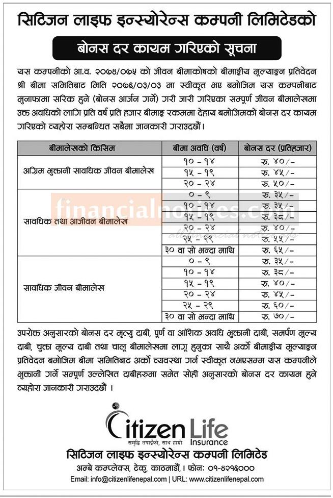 सिटिजन लाइफ इन्स्योरेन्स कम्पनीले आफ्ना बीमितहरुलाई नयाँ बोनस दर घोषणा गरेको छ । कम्पनीले समितिको स्वीकृत पाएपछि बीमतिलाई दिने बोनस दर घोषणा गरेको हो ।