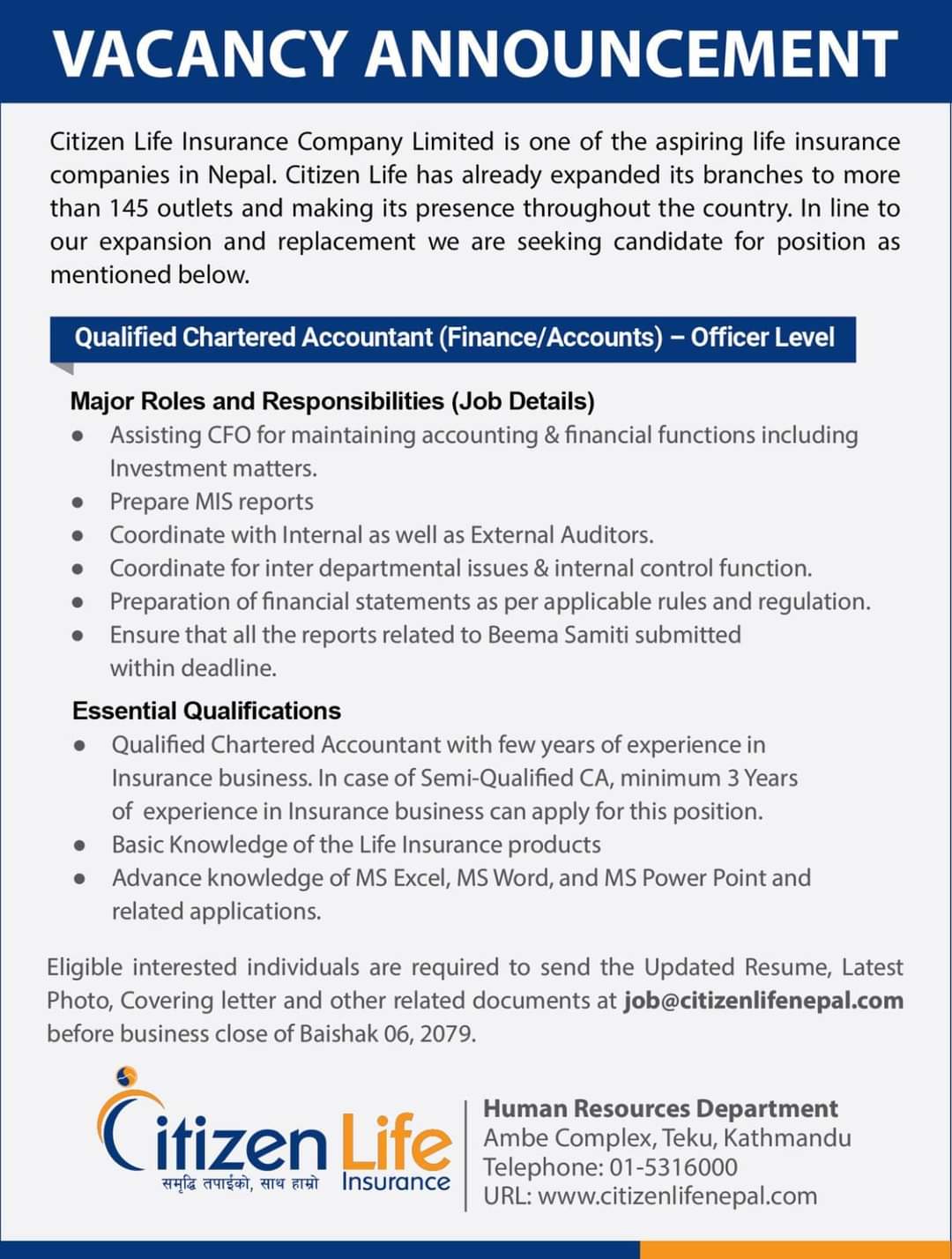 बीमा कम्पनी सम्बन्धमा १ वर्षको अनुभव प्राप्त दक्ष चार्टर्ड अकाउन्टेन्ट वा बीमा कम्पनी सम्बन्धमा ३ वर्षको अनुभव प्राप्त अद्र्ध दक्ष चार्टर्ड अकाउन्टेन्टले नियुक्तिको लागी आवेदन दिन सक्नेछन् । अन्य आवश्यक योग्यतामा जीवन बीमा योजनाहरुबारे सामान्य जानकारी भएको, माइक्रोसफ्ट अफिस प्याकेज प्रयोग गर्न सक्ने हुनुपर्ने उल्लेख छ । इच्छुक उम्मेदवारलाई बैशाख ६ गतेभित्रमा इमेलमार्फत् आवेदन दिनको लागी कम्पनीले आग्रह गरेको छ ।