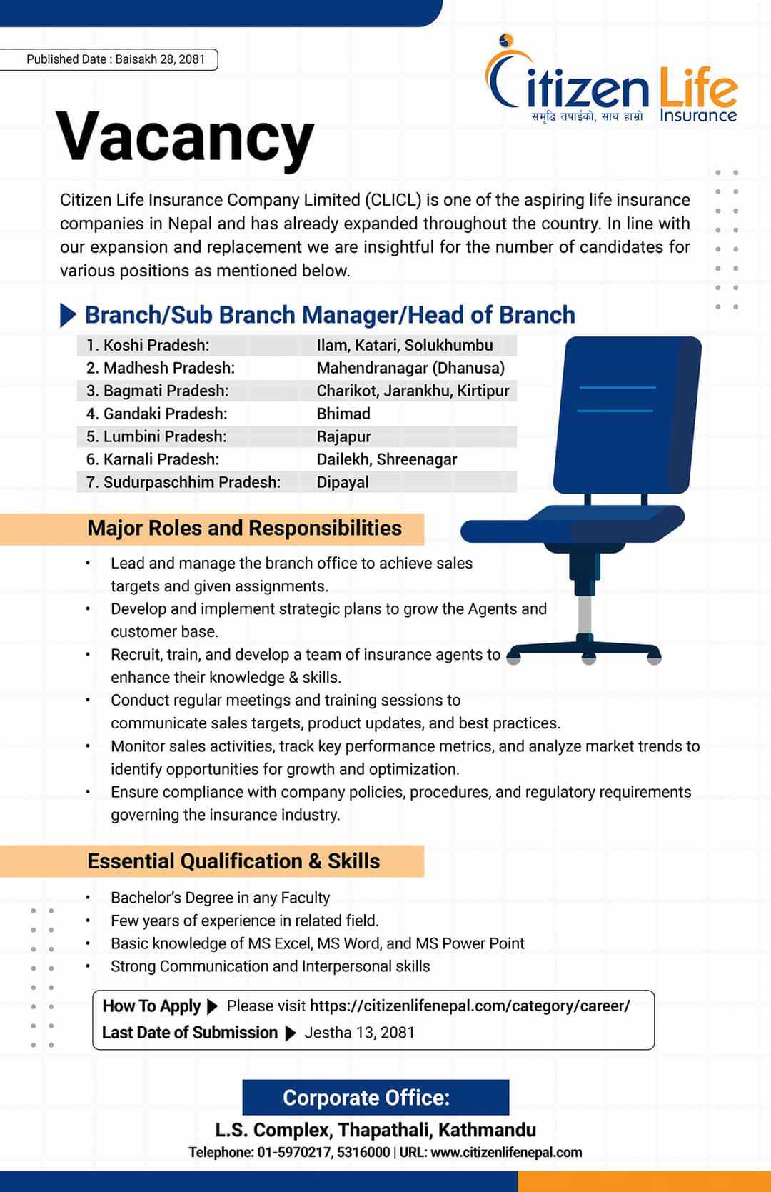 काठमाडौं । सिटिजन लाइफ इन्स्योरेन्स कम्पनीले सातै प्रदेशका लागि कर्मचारी माग गरेको छ । कम्पनीले ब्रान्च, सव ब्रान्च म्यानेजर र हेड अफ ब्रान्चका लागि कर्मचारी माग गरेको हो ।