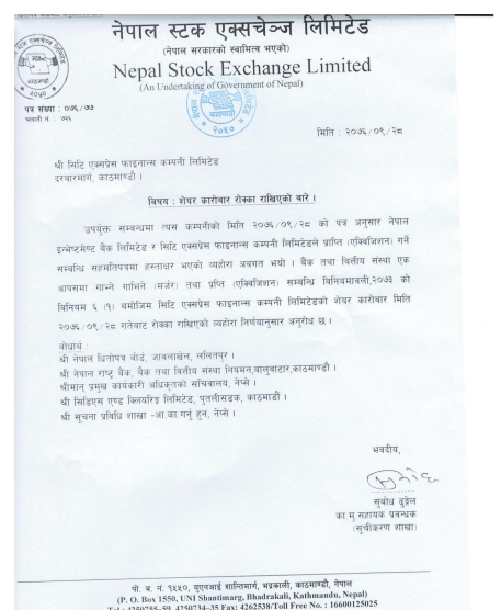 काठमाडौं । सिटी एक्सप्रेस फाइनान्सको शेयर कारोबार रोक्का भएको छ । नेपाल इन्भेष्टमेन्ट बैंकले प्राप्ति गर्ने भएसँगै फाइनान्सको आज सोमबार देखि दोस्रो बजारमा सेयर कारोबार रोक्का गरिएको जनाएको छ ।