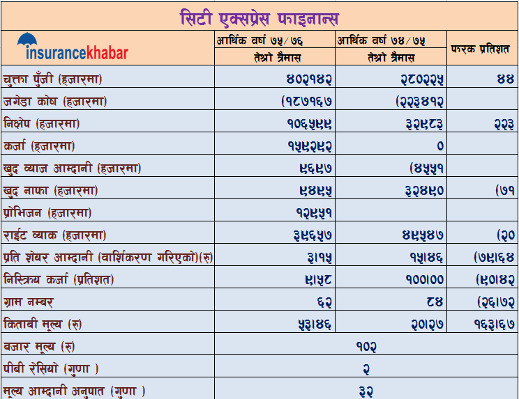 कम्पनीको खुद नाफा भने ७१ प्रतिशतले कम हुँदै ९४ लाख ९५ हजार पुगेको छ। कम्पनीले गत आर्थिक वर्षको तेश्रो त्रैमासमा कुनै प्रोभिजनन नगरेको अहिले आएर १ करोड २९ लाख प्रोभिजन गरेको छ। कम्पनीले ३ करोड ९६ लाख राईट व्याक गरेको छ।