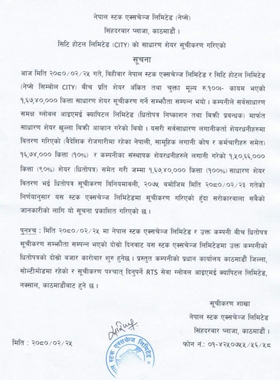 काठमाडौं । सिटी होटलको आइपिओ दोस्रो बजारमा सूचिकृत भएको छ । कम्पनीले नेपाल स्टक एक्सचेन्जमा कुल एक करोड ६७ लाख ४० हजार कित्ता शेयर सूचिकृत गरेको हो । कम्पनीले वैदेशिक रोजगारीमा रहेका नेपाली, सामूहिक लगानी कोष, कर्मचारी र सर्वसाधारणका लागि निष्काशन गरि बाँडफाँट गरेको र संस्थापक शेयरधनीहरुहरुको शेयर नेप्सेमा सूचीकृत गरेको छ ।