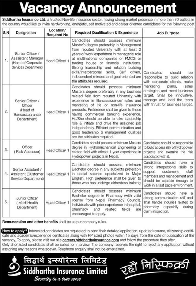 सिद्धार्थ इन्स्योरेन्स कम्पनीमा रोजगार खुलेको छ । कम्पनीले एक विज्ञापन जारी गर्दै हेड अफिसका लागि विभिन्न पदका लागि कर्मचारीहरु आह्वान गरेको छ ।