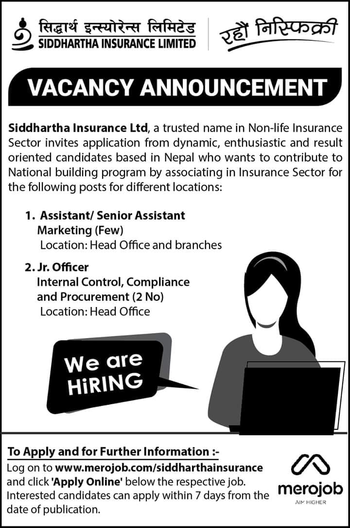 काठमाडौं । सिद्धार्थ इन्स्योरेन्स कम्पनीले विभिन्न पदका लागि कर्मचारीको माग गरेको छ । कम्पनीले असिस्टेन्ट र सिनियर असिस्टेन्ट मार्केटिङका लागि केही र जूनियर अफिसरका लागि केही संख्यामा कर्मचारीको माग गरेको जनाएको छ ।