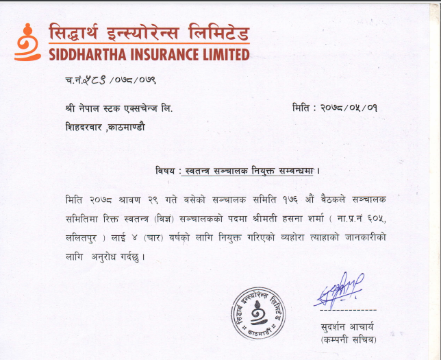 काठमाडौं । सिद्धार्थ इन्स्योरेन्स कम्पनीको स्वतन्त्र सञ्चालकमा हसना शर्मा नियुक्त भएकी छिन् । कम्पनीको साउन २९ गते बसेको सञ्चालक समितिको बैठकले आगामी चार वर्षका लागि रिक्त स्वतन्त्र सञ्चालकमा शर्मालाई नियुक्त गरेको हो ।