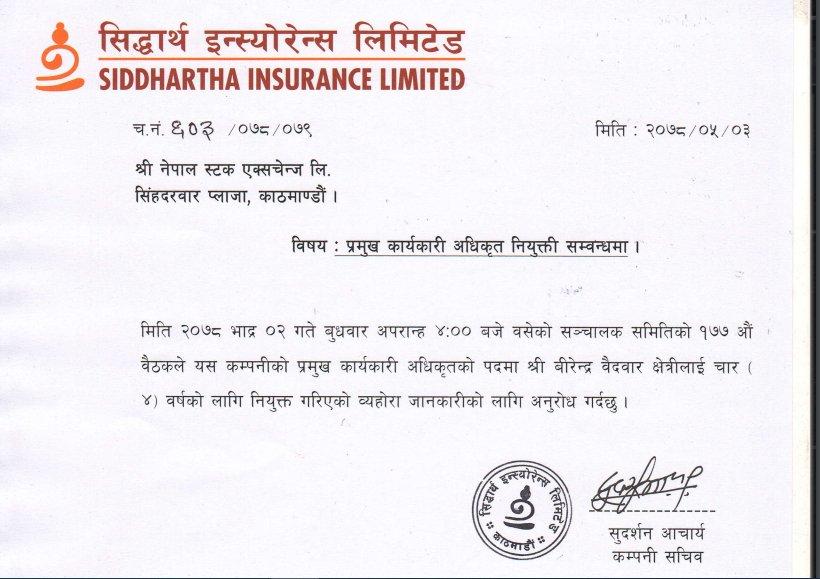 काठमाडौं । सिद्धार्थ इन्स्योरेन्सको प्रमुख कार्यकारी अधिकृत (सिइओ) मा बीरेन्द्र वैदवार क्षेत्री नियुक्त भएका छन् । कम्पनीको बुधवार बसेको सञ्चालक समितिको बैठकले उनलाई आगामी चार वर्षका लागि सिइओमा नियुक्त गरेको हो ।