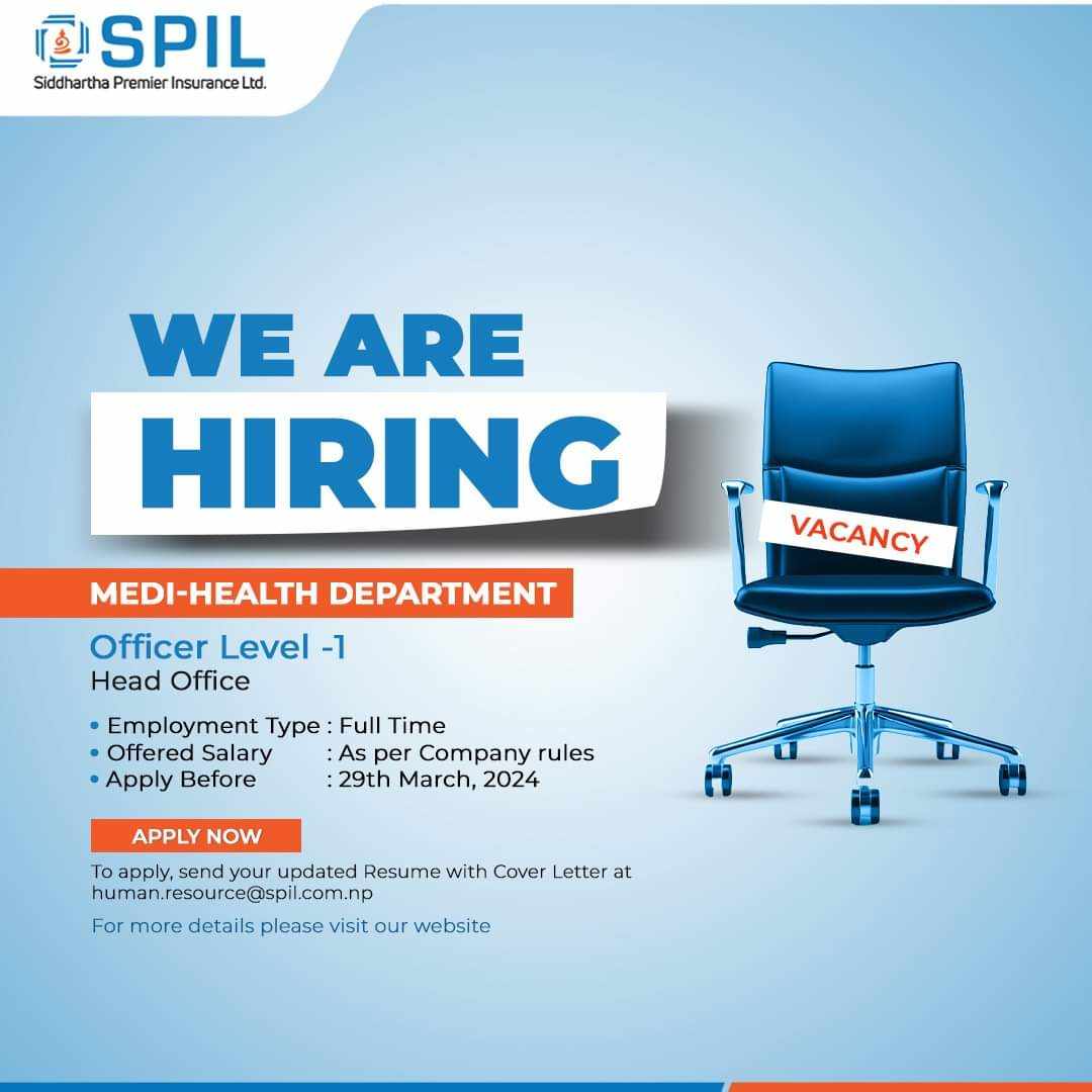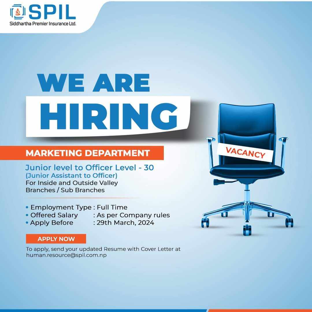 काठमाडौं । सिद्धार्थ प्रिमियर इन्स्योरेन्स कम्पनीले कर्मचारी दरखास्त आव्हान गरेको छ । कम्पनीले मार्केटिङ डिपार्टमेन्टमा, जूनियर लेभल टु अफिसरका लागि ३० जना, मेडिकल हेल्थ डिपार्टमेन्टमा अफिसर लेभलका लागि १ जना गरी ३१ जना कर्मचारी माग गरेको हो । कम्पनीले हेड अफिस, उपत्यकाभित्र ततथा बाहिरका विभिन्न शाखा उपशाखा कार्यालयका लागि कर्मचारी माग गरेको जनाइएको छ । ईच्छुक तथा योग्यता पुगेकाले चैत १६ गते कार्यालय समयभित्र आवेदन दिनुपर्नेछ ।