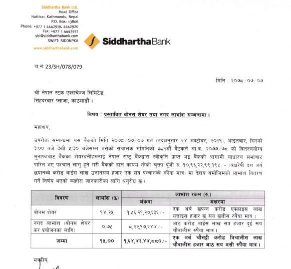काठमाडौं । सिद्धार्थ बैंकले लाभांश प्रस्ताव गरेको छ । कम्पनीको आइतबार बसेको संचालक समितिको बैठकले आर्थिक वर्ष ७७/७८ को मुनाफाबाट आफ्ना शेयरधनीलाई वितरण गर्ने लाभांश प्रस्ताव गरेको हो ।