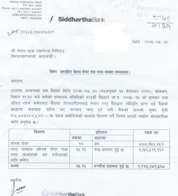 नियामक राष्ट्र बैंक र आगामी वार्षिक साधारण सभाले अनुमोदन गरेपछि लगानीकर्तालाई वितरण गरिनेछ ।
