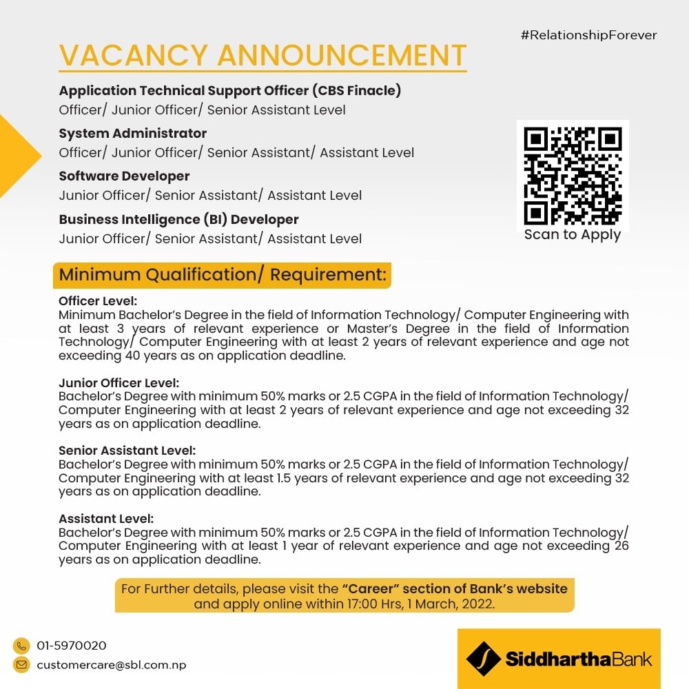 त्यसैगरी कम्पनीले सफट्वयेर डेभलपरमा जुनियर अफिसर, सिनियर असिस्टेन्ट र असिस्टेन्टका लागि केही र बिआईका लागि जुनियर अफिसर, सिनियर असिस्टेन्ट र असिस्टेन्टका लागि केही संख्यामा कर्मचारीको माग गरेको हो ।