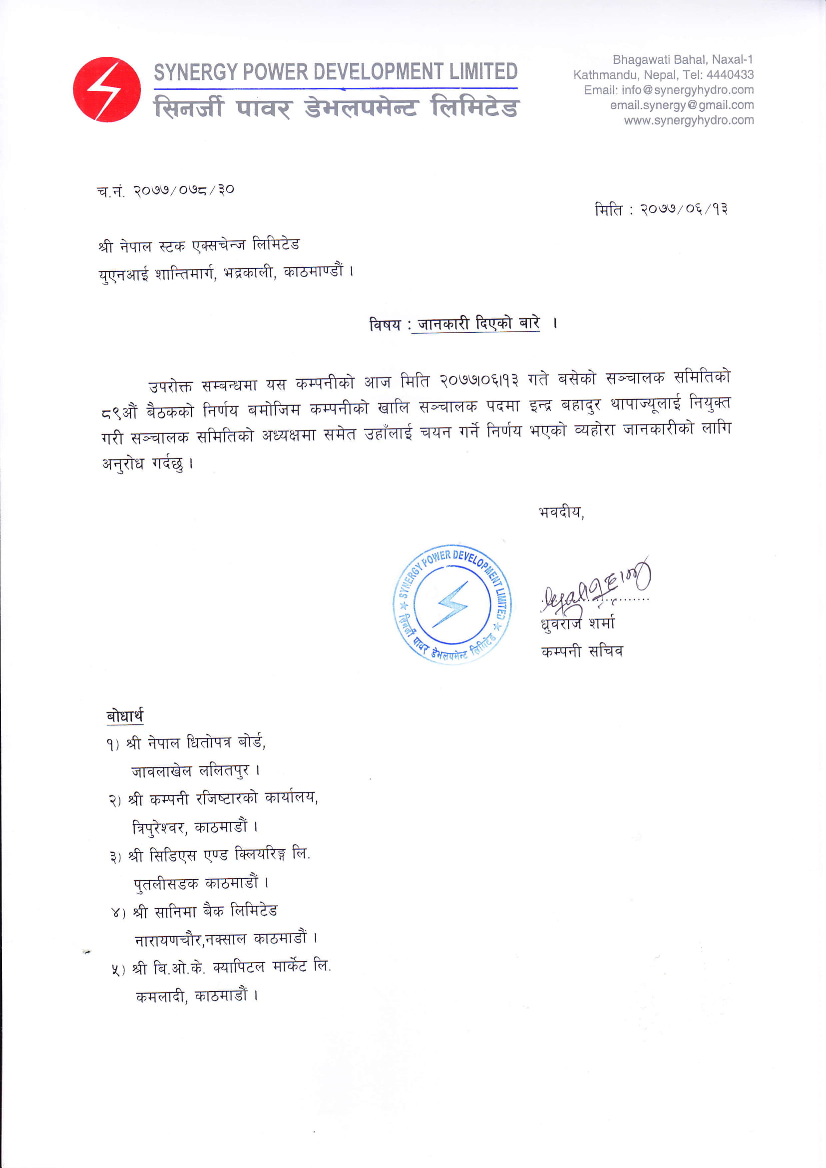 कम्पनीको खाली रहेको सञ्चालक पदमा थापालाई नियुक्त गरि सञ्चालक समितिको अध्यक्षमा समेत उनलाई चयन गरिएको कम्पनीले जनाएको छ ।