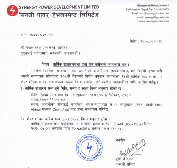 काठमाडौं । सिनर्जी पावर डेभलपमेन्ट लिमिटेडले १५औ बार्षिक साधारणसभा भदौ १८ गते शुक्रबार गर्ने भएको छ । कम्पनीको मंगलबार बसेको संचालक समितिको बैठकले उक्त सभाको मिति तय गरेको हो । सभा कम्पनीले भर्चुअल माध्यमबाट गर्ने जनाएको छ ।