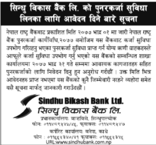 बैंकले, नेपाल राष्ट्र बैंक पुनरकर्जा कार्यविधी बमोजिम पुर्नकर्जा सुविधा प्राप्त गर्न योग्य बैंकका ग्राहकहरुलाई आवश्यक कागजात सहित निवेदन दिन हुन सूचित गरेको छ ।