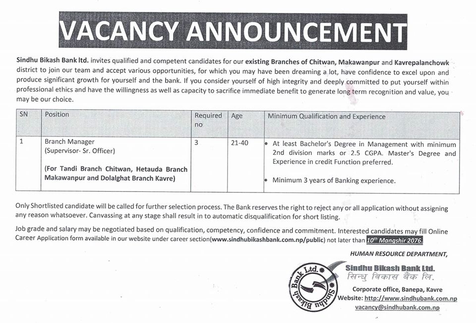 बैंकले चितवन, हेटौंडा, मकवानपुर र दोलालघाट ब्रान्चका लागि कर्मचारीको माग गरिएको जनाएको छ ।