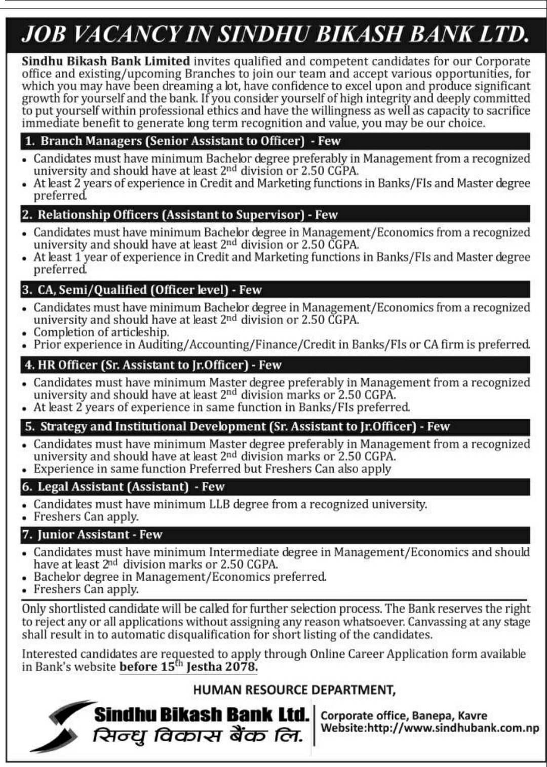 काठमाडौं । सिन्धु विकास बैंकले विभिन्न पदका लागि कर्मचारीको माग गरेको छ । बैंकले ब्रान्च म्यानेजर९सिनियर, असिस्टेन्टदेखि अफिसरसम्म०का लागि केही, रिलेशनसिप अफिसरका लागि केही, सिएका लागि केही, एचआर अफिसरका लागि केही , स्ट्रेजी एण्ड इन्स्च्यिुटल डेभलपमेन्टका लागि केही, लिगेल असिस्टेन्टका लागि केही र जुनियर असिस्टेन्टका लागी केही संख्यामा कर्मचारीको माग गरेको हो ।