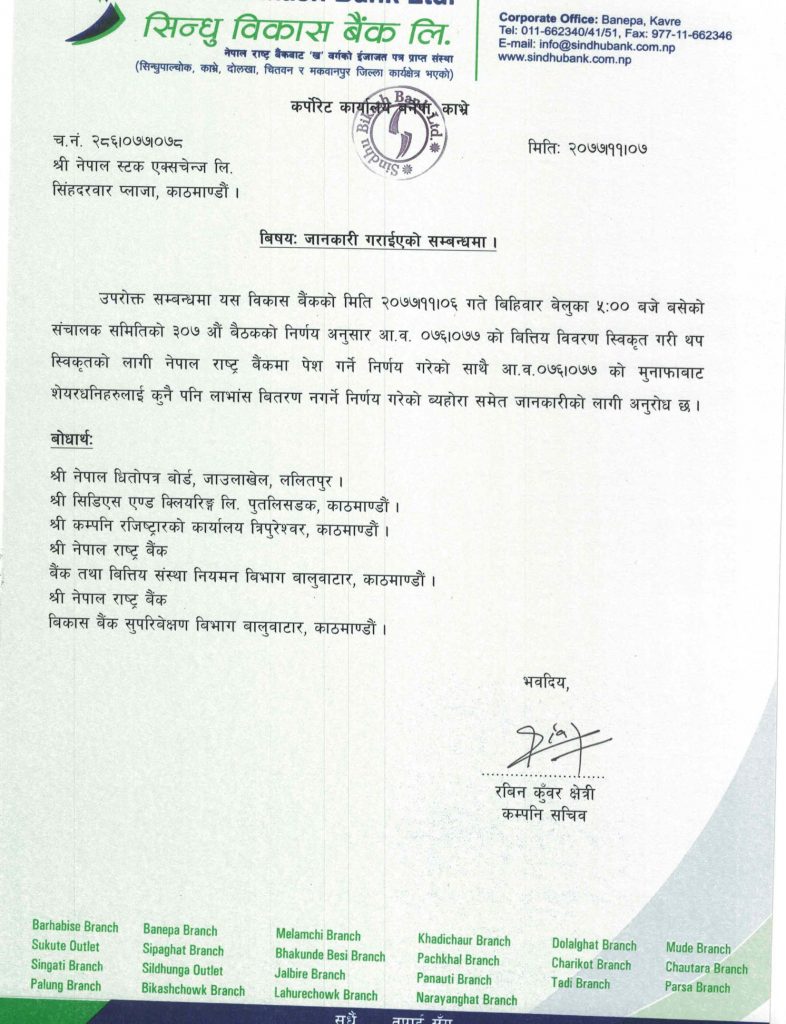 काठमाडौं । सिन्धु विकास बैंकले चालु आर्थिक वर्ष २०७६÷७७ को नाफाबाट शेयरधनीहरूलाई लाभांश वितरण नगर्ने भएको छ ।