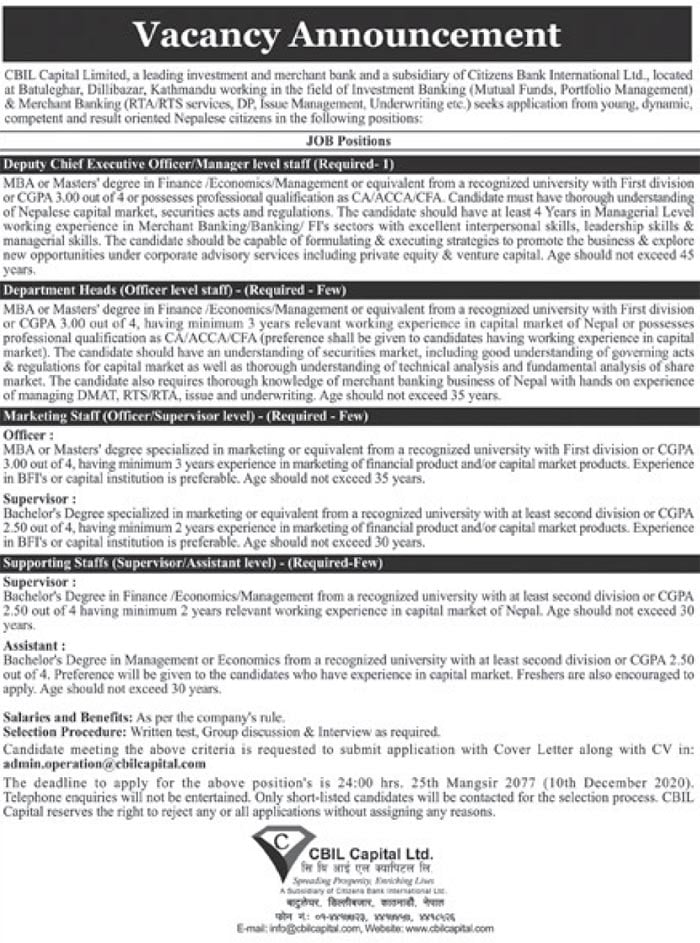 काठमाडौं । सिबिआईएल क्यापीटलले विभिन्न पदका लागि कर्मचारीको माग गरेको छ । क्यापीटलले डेपुटी चिफ एक्जुकेटिभ अफिसरका लागि १ जना, डिपार्टमेन्ट हेड अफिसरका लागि केही, सपोर्टिङका लागि केही संख्यामा कर्मचारीको माग गरेको जनाएको छ ।