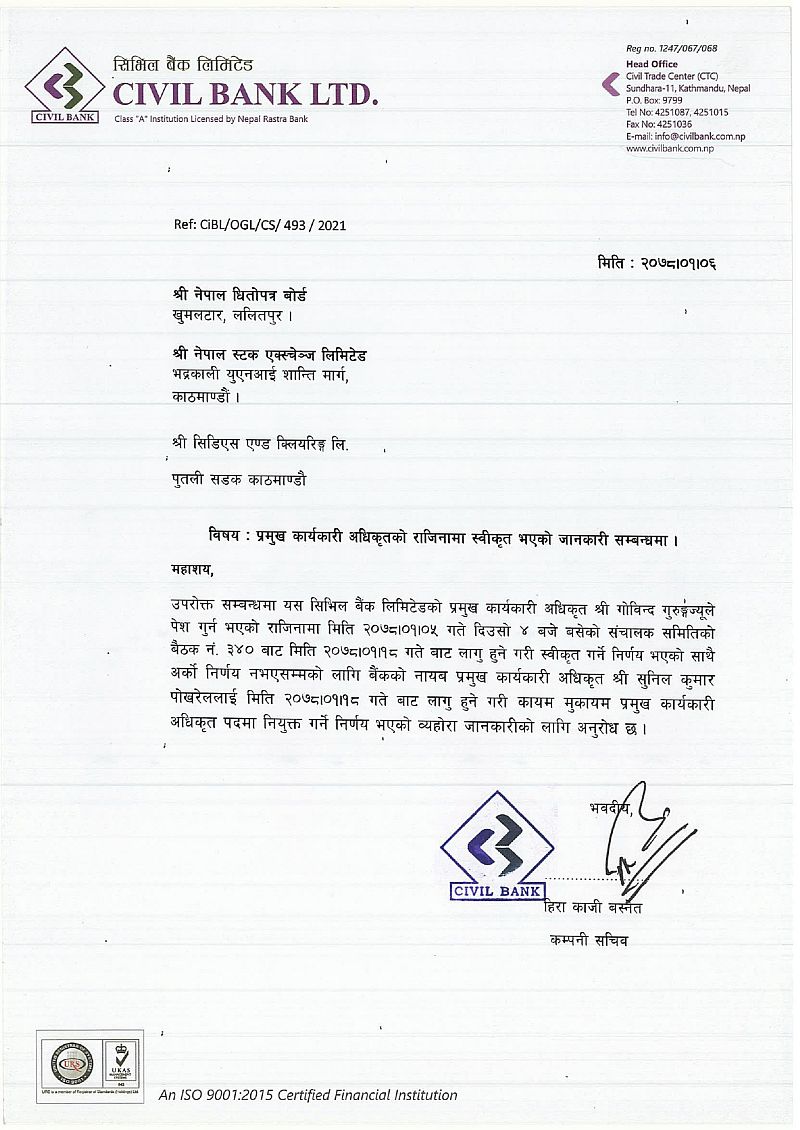 साथै, अर्को व्यबस्था नहुञ्जेल सम्मको लागि कम्पनीको नायव प्रमुख कार्यकारी अधिकृत सुनिल कुमार पोखरेललाई बैशाख १८ गतेदेखि लागू हुने गरी कम्पनीको कायम मुकायम प्रमुख कार्यकारी अधिकृत पदमा नियुक्त गर्ने बैंकले जनाएको छ ।