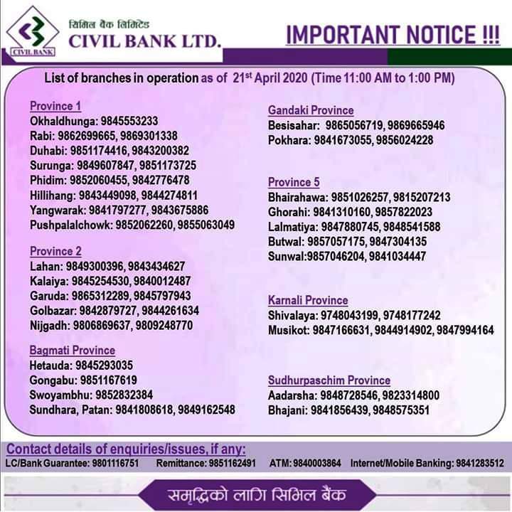सिभिल बैंकको आज खुला रहने शाखा कार्यालयहरु