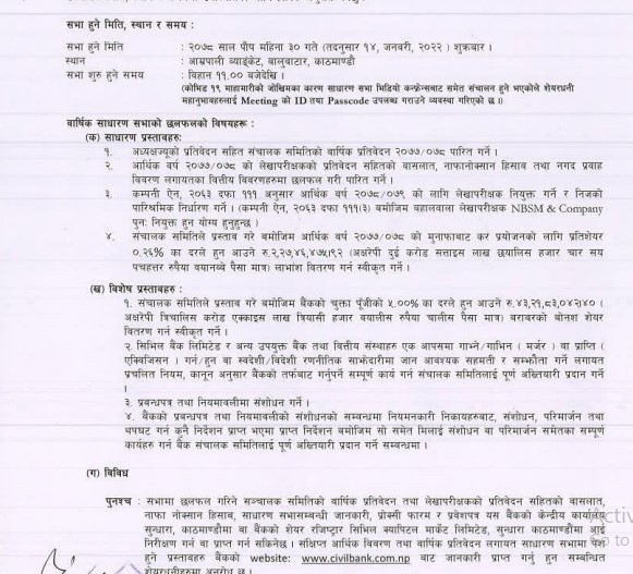 त्यसैगरी सभाले आथिृक वर्ष २०७८/७९ (२०२१/२२) को लागि लेखा परीक्षक नियुक्त गर्ने र निजको पारिश्रमिक निर्धारण गर्ने, लगायतका प्रस्ताव पेश हुने छ । त्यस्तै अन्य उपयुक्त बैंक तथा वित्तीय संस्थाहरूसँग एक आपसमा गाभ्न गाभिन ९मर्जर गर्न वा प्राप्ति गर्न कार्य अगाडि बढाउन सञ्चालक समितिलाई अख्तियारी प्रदान गर्ने प्रस्ताव ापरित गर्नेछ ।