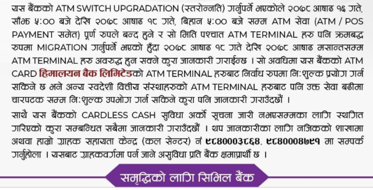 त्यस्तै सो मिति पश्चात पनि एटिएम टर्मिनलहरु क्रमबद्ध रुपमा माइग्रेसन गर्नुपर्ने भएकोले असार १८ गते देखि आसार मसान्तसम्म एटिएम टर्मिनलहरु अवरुद्ध हुन सक्ने बैंकले सूचनामा उल्लेख गरेको छ । बैंकको कार्डलेस क्यास सुविधा अर्को सूचना जारी नभएसम्मका लागि स्थगित गरिएको बैंकले जनाएको छ ।