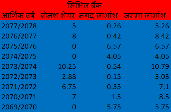 काठमाडौं । सिभिल बैंकले लाभांश घोषणा गरेको छ । पुस ५ गते बसेको सञ्चालक समितिको बैठकले गत आर्थिक वर्ष २०७७/७८ को मुनाफाबाट ५ प्रतिशत बोनश शेयर र बोनश शेयरमा लाग्ने कर प्रयोजनका लागि ०.२६ प्रतिशत नगद लाभांश घोषणा गरेको हो ।