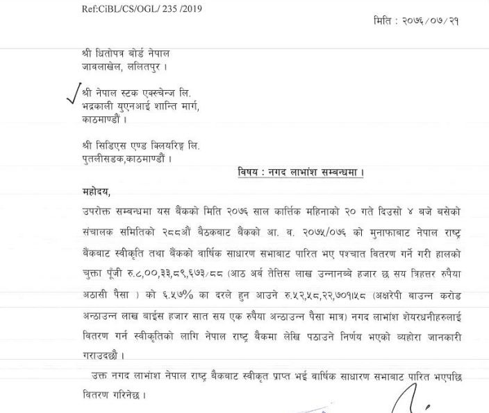 नियामक राष्ट्र बैंक र आगामी साधारण सभाले अनुमोदन गरेपछि वितरण सुरु गरिनेछ ।