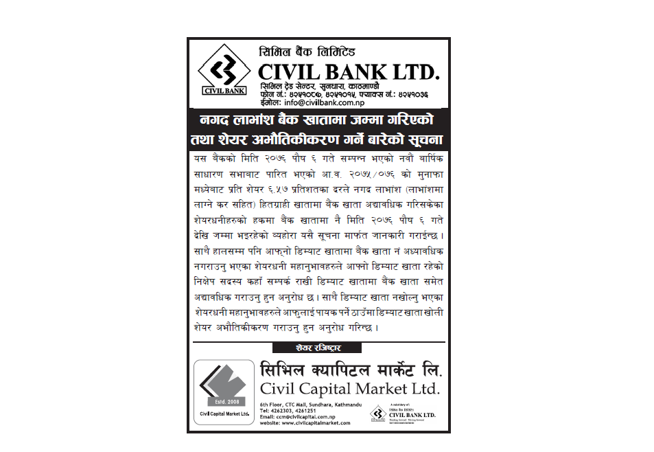 ईच्छुक तथा योग्यता पुगेकाले माघ २२ गतेभित्र आवेदन दिइसक्नुपर्ने जनाएको छ । थप जानकारीको लागि यो https://www.civilbank.com.np/लिंकमा क्लिक गर्नुहोस्